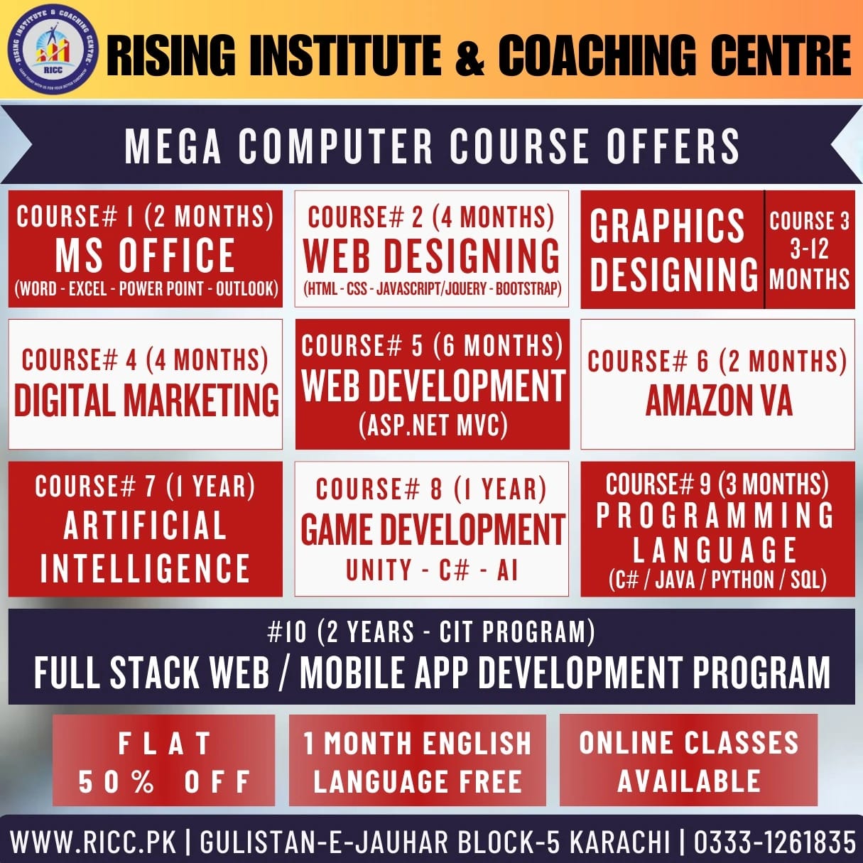 RICC is offering manny short and long term programs which includes Web Designing, Graphics Designing, Web Development, Digital Marketing, Amazon VA & 1-3 Years CIT Programs.